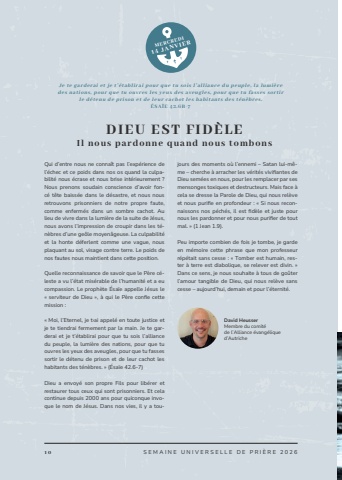 1 0 SEMAINE UNIVERSELLE DE PRI%u00c8RE 2026DIEU EST FID%u00c8LEIl nous pardonne quand nous tombonsDavid HeusserMembre du comit%u00e9de l%u2019Alliance %u00e9vang%u00e9lique d%u2019Autrichejours des moments o%u00f9 l%u2019ennemi %u2013 Satan lui-m%u00eame %u2013 cherche %u00e0 arracher les v%u00e9rit%u00e9s vivifiantes de Dieu sem%u00e9es en nous, pour les remplacer par ses mensonges toxiques et destructeurs. Mais face %u00e0 cela se dresse la Parole de Dieu, qui nous rel%u00e8ve et nous purifie en profondeur : %u00ab Si nous reconnaissons nos p%u00e9ch%u00e9s, il est fid%u00e8le et juste pour nous les pardonner et pour nous purifier de tout mal. %u00bb (1 Jean 1.9).Peu importe combien de fois je tombe, je garde en m%u00e9moire cette phrase que mon professeur r%u00e9p%u00e9tait sans cesse : %u00ab Tomber est humain, rester %u00e0 terre est diabolique, se relever est divin. %u00bb Dans ce sens, je nous souhaite %u00e0 tous de go%u00fbter l%u2019amour tangible de Dieu, qui nous rel%u00e8ve sans cesse %u2013 aujourd%u2019hui, demain et pour l%u2019%u00e9ternit%u00e9.Qui d%u2019entre nous ne conna%u00eet pas l%u2019exp%u00e9rience de l%u2019%u00e9chec et ce poids dans nos os quand la culpabilit%u00e9 nous %u00e9crase et nous brise int%u00e9rieurement ? Nous prenons soudain conscience d%u2019avoir fonc%u00e9 t%u00eate baiss%u00e9e dans le d%u00e9sastre, et nous nous retrouvons prisonniers de notre propre faute, comme enferm%u00e9s dans un sombre cachot. Au lieu de vivre dans la lumi%u00e8re de la suite de J%u00e9sus, nous avons l%u2019impression de croupir dans les t%u00e9n%u00e8bres d%u2019une ge%u00f4le moyen%u00e2geuse. La culpabilit%u00e9 et la honte d%u00e9ferlent comme une vague, nous plaquant au sol, visage contre terre. Le poids de nos fautes nous maintient dans cette position.Quelle reconnaissance de savoir que le P%u00e8re c%u00e9leste a vu l%u2019%u00e9tat mis%u00e9rable de l%u2019humanit%u00e9 et a eu compassion. Le proph%u00e8te %u00c9sa%u00efe appelle J%u00e9sus le %u00ab serviteur de Dieu %u00bb, %u00e0 qui le P%u00e8re confie cette mission :%u00ab Moi, l%u2019Eternel, je t%u203aai appel%u00e9 en toute justice et je te tiendrai fermement par la main. Je te garderai et je t%u2019%u00e9tablirai pour que tu sois l%u2019alliance du peuple, la lumi%u00e8re des nations, pour que tu ouvres les yeux des aveugles, pour que tu fasses sortir le d%u00e9tenu de prison et de leur cachot les habitants des t%u00e9n%u00e8bres. %u00bb (%u00c9sa%u00efe 42.6-7)Dieu a envoy%u00e9 son propre Fils pour lib%u00e9rer et restaurer tous ceux qui sont prisonniers. Et cela continue depuis 2000 ans pour quiconque invoque le nom de J%u00e9sus. Dans nos vies, il y a touMERCREDI14 JANVIERJe te garderai et je t%u2019%u00e9tablirai pour que tu sois l%u2019alliance du peuple, la lumi%u00e8redes nations, pour que tu ouvres les yeux des aveugles, pour que tu fasses sortirle d%u00e9tenu de prison et de leur cachot les habitants des t%u00e9n%u00e8bres.%u00c9SA%u00cfE 42.6B-7