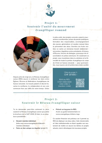 Projet 1:Soutenir l%u2019unit%u00e9 du mouvement%u00e9vang%u00e9lique romandDepuis pr%u00e8s de vingt ans, le R%u00e9seau %u00e9vang%u00e9lique suisse (RES) %u0153uvre %u00e0 renforcer les liens entre %u00c9glises, %u0152uvres et f%u00e9d%u00e9rations %u00e9vang%u00e9liques de Suisse romande. Ce travail patient et discret favorise la confiance, la collaboration et une voix commune face aux d%u00e9fis de notre temps. Gr%u00e2ce PRIER E TAGIR%u00e0 cette unit%u00e9, des projets concrets voient le jour : actions coordonn%u00e9es, prises de parole publiques, formation des responsables, accompagnement des jeunes g%u00e9n%u00e9rations et soutien mutuel dans la pr%u00e9vention des abus. Derri%u00e8re ces fruits visibles se cache un immense travail relationnel : rencontres r%u00e9guli%u00e8res entre pr%u00e9sidents d%u2019Unions, d%u2019%u0152uvres, forums de dialogue, processus de r%u00e9conciliation et pri%u00e8re commune. En soutenant ce projet, vous investissez dans la coh%u00e9sion et la f%u00e9condit%u00e9 de toute la portion %u00e9vang%u00e9lique du corps de Christ en Suisse romande %u2014 pour qu%u2019ensemble, nous soyons sel et lumi%u00e8re dans notre soci%u00e9t%u00e9.Projet 2:Soutenir le R%u00e9seau %u00e9vang%u00e9lique suisseTu te demandes peut-%u00eatre comment tu peux soutenir le R%u00e9seau %u00e9vang%u00e9lique suisse qui publie la brochure de la SUP 2026. Et bien, tu as plusieurs possibilit%u00e9s :%u2022 Devenir membre individuel(infos sous www.evangelique.ch/devenirmembre-individuel%u2022 Faire un don unique ou r%u00e9gulier (projet 2)%u2022 Pr%u00e9voir un leg pour le RES.Acc%u00e8s au guide testamentaire ici:www.evangelique.ch/dons-legsCe soutien financier est pr%u00e9cieux car il permet au RES de d%u00e9ployer ses deux ailes, l%u2019aile missionnelle et l%u2019aile institutionnelle en %u00e9tant capable non seulement de mettre en %u0153uvre les t%u00e2ches et projets actuels, mais %u00e0 d%u00e9velopper de nouveaux projets.IBAN du RES:CH07 0900 00001002 2381 5(mention: Unit%u00e9)Cible du projet 1:CHF 20%u2019000.%u2212