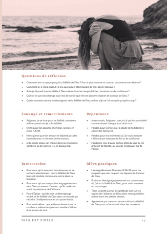 Questions de r%u00e9flexion%u2022 Comment est-ce que je per%u00e7ois la fid%u00e9lit%u00e9 de Dieu ? Est-ce plus comme un contrat ou comme une alliance ? %u2022 Comment ai-je r%u00e9agi quand j%u2019ai cru que Dieu s%u2019%u00e9tait %u00e9loign%u00e9 de moi dans l%u2019%u00e9preuve ?%u2022 Suis-je dispos%u00e9 %u00e0 rester fid%u00e8le %u00e0 Dieu m%u00eame dans les temps d%u2019%u00e9chec, de doute ou de souffrance ?%u2022 Qu%u2019est-ce que cela change pour moi de savoir que rien ne peut me s%u00e9parer de l%u2019amour de Dieu ?%u2022 Quels moments de ma vie t%u00e9moignent de la fid%u00e9lit%u00e9 de Dieu, m%u00eame si je ne l%u2019ai compris qu%u2019apr%u00e8s coup ?DIEU EST FID%u00c8LE 1 7Louange et remerciements%u2022 Seigneur, je te loue pour ta fid%u00e9lit%u00e9 constante, m%u00eame quand moi je suis infid%u00e8le.%u2022 Merci pour ton alliance %u00e9ternelle, scell%u00e9e en J%u00e9sus-Christ.%u2022 Merci parce que ton amour ne d%u00e9pend pas des circonstances, ni de mes performances.%u2022 Je te rends gr%u00e2ce car, m%u00eame dans les moments sombres ou de silence, Tu es toujours l%u00e0.Repentance%u2022 Je reconnais, Seigneur, que je t%u2019ai parfois consid%u00e9r%u00e9 comme absent lorsque tout allait mal.%u2022 Pardon pour les fois o%u00f9 j%u2019ai dout%u00e9 de ta fid%u00e9lit%u00e9 %u00e0 cause des %u00e9preuves.%u2022 Pardon pour les moments o%u00f9 j%u2019ai voulu rompre l%u2019alliance par manque de foi ou de confiance.%u2022 Pardonne-moi d%u2019avoir parfois attendu que tu me prouves ta fid%u00e9lit%u00e9, au lieu de m%u2019appuyer sur ta Parole.Intercession%u2022 Pour ceux qui traversent des %u00e9preuves et se sentent abandonn%u00e9s : que la fid%u00e9lit%u00e9 de Dieu leur soit r%u00e9v%u00e9l%u00e9e comme une ancre dans la temp%u00eate.%u2022 Pour ceux qui ont rompu leur engagement envers Dieu ou envers d%u2019autres : qu%u2019ils red%u00e9couvrent la puissance de l%u2019alliance.%u2022 Pour l%u2019%u00c9glise : qu%u2019elle soit un t%u00e9moignage vivant de la fid%u00e9lit%u00e9 de Dieu dans un monde qui valorise l%u2019ind%u00e9pendance et la rupture facile.%u2022 Pour moi-m%u00eame : que je tienne ferme dans la confiance, m%u00eame lorsque tout semble s%u2019effondrer autour de moi.%u2022 Lire r%u00e9guli%u00e8rement Romains 8,38-39 pour me rappeler que rien ne peut me s%u00e9parer de l%u2019amour de Dieu.%u2022 %u00c9crire un t%u00e9moignage personnel sur un moment o%u00f9 j%u2019ai vu la fid%u00e9lit%u00e9 de Dieu, pour m%u2019en souvenir ou le partager.%u2022 Tenir un petit journal de gratitude ax%u00e9 sur les signes de l%u2019alliance de Dieu dans mon quotidien, m%u00eame dans les petites choses.%u2022 Apprendre par c%u0153ur un verset-cl%u00e9 sur la fid%u00e9lit%u00e9 de Dieu pour m%u2019en nourrir dans les moments.Id%u00e9es pratiques