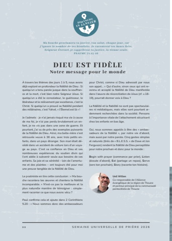 2 2 SEMAINE UNIVERSELLE DE PRI%u00c8RE 2026DIEU EST FID%u00c8LENotre message pour le mondeUeli WillenCo-responsable de l%u2019Alliance %u00e9vang%u00e9lique de la r%u00e9gion de Thouneet pasteur principal de la communaut%u00e9 pentec%u00f4tiste de Thounepour Christ, comme si Dieu adressait par nous son appel%u2026 %u00bb Qui d%u2019autre, sinon ceux qui ont reconnu et accept%u00e9 la fid%u00e9lit%u00e9 de Dieu manifest%u00e9e dans l%u2019%u0153uvre de r%u00e9conciliation de J%u00e9sus (cf. v.18-19), pourrait donner voix %u00e0 Dieu ?La fid%u00e9lit%u00e9 et la fiabilit%u00e9 ne sont pas spectaculaires ni m%u00e9diatiques, mais elles sont pourtant ardemment recherch%u00e9es dans la soci%u00e9t%u00e9. Pensons %u00e0 l%u2019importance vitale de l%u2019attachement s%u00e9curisant chez les enfants en bas %u00e2ge.Oui, nous sommes appel%u00e9s %u00e0 %u00eatre des %u00ab ambassadeurs de la fid%u00e9lit%u00e9 %u00bb, par notre vie d%u2019abord, mais aussi par notre parole. Cinq gestes simples et naturels (tir%u00e9s de %u00ab B.L.E.S.S. %u00bb de Dave et Jon Ferguson) rendent la fid%u00e9lit%u00e9 de Dieu perceptible pour notre prochain et donc pour le monde :Begin with prayer (commence par prier), Listen (%u00e9coute d%u2019abord), Eat (partage un repas), Serve (sers ton prochain), Story (raconte ton histoire).%u00c0 travers les th%u00e8mes des jours 1 %u00e0 5, nous avons d%u00e9j%u00e0 explor%u00e9 en profondeur la fid%u00e9lit%u00e9 de Dieu : Si quelqu%u2019un a tenu parole jusque dans la souffrance et la mort, c%u2019est bien notre Seigneur J%u00e9sus. Si quelqu%u2019un a %u00e9t%u00e9 le consolateur, le gu%u00e9risseur, le lib%u00e9rateur et le rel%u00e8vement par excellence, c%u2019est le Christ. Si quelqu%u2019un a prouv%u00e9 sa fiabilit%u00e9 pendant des mill%u00e9naires, c%u2019est Yahv%u00e9, %u00ab l%u2019%u00c9ternel est l%u00e0 %u00bb !Je l%u2019admets : je n%u2019ai jamais risqu%u00e9 ma vie %u00e0 cause de ma foi, je n%u2019ai pas perdu brutalement un enfant, je ne vis pas dans une zone de guerre. Et pourtant, j%u2019ai vu de pr%u00e8s des exemples puissants de la fid%u00e9lit%u00e9 de Dieu. Ainsi, ma belle-m%u00e8re s%u2019est retrouv%u00e9e veuve %u00e0 36 ans, avec trois petits enfants, dans un pays %u00e9tranger. Son mari %u00e9tait d%u00e9c%u00e9d%u00e9 dans un accident de voiture lors d%u2019un voyage au pays. C%u2019est sa confiance en Dieu et ses nombreuses exp%u00e9riences du soutien divin qui l%u2019ont aid%u00e9e %u00e0 subvenir seule aux besoins de ses enfants. Sa joie et sa s%u00e9r%u00e9nit%u00e9 %u2013 loin de l%u2019amertume et des plaintes %u2013 ont toujours %u00e9t%u00e9 pour moi une preuve tangible de la fid%u00e9lit%u00e9 de Dieu.Le psalmiste en tire cette conclusion : %u00ab Ma bouche racontera tes %u0153uvres et chantera ta fid%u00e9lit%u00e9 incomparable. %u00bb N%u2019est-ce pas la meilleure et la plus naturelle mani%u00e8re de t%u00e9moigner : simplement raconter ce que nous avons v%u00e9cu ?Paul confirme cela et ajoute dans 2 Corinthiens 5.20 : %u00ab Nous sommes donc des ambassadeurs DIMANCHE18 JANVIERM a b o u c h e p r o c l a m e r a t a j u s t i c e , t o n s a l u t , c h a q u e j o u r , c a r j %u2019 i g n o r e l e n o m b r e d e t e s b i e n f a i t s . J e r a c o n t e r a i t e s h a u t s f a i t s , Seigneur %u00c9ternel, je rappellerai ta justice, la tienne seule.PSAUME 71.15-16