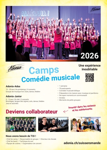 %u2022 1 semaine%u2022 70 participants%u2022 Com%u00e9die musicale biblique%u2022 Pr%u00e9paration %u00e0 la maison avec musique et partitions%u2022 De super moments en communaut%u00e9%u2022 Amiti%u00e9s%u2022 Moments de petits groupesCamps Com%u00e9die musicaleAdonia-Ados13 - 20 ans | Au printemps | 4 concertsGroupe de musique live | Solo, danse, th%u00e9%u00e2treAdonia-Junior9 - 13 ans | En %u00e9t%u00e9 | 2 concertsBricolages, langue des signes, solo, danse, th%u00e9%u00e2treJeux et activit%u00e9s2026Une exp%u00e9rience inoubliableDeviens collaborateurNous avons besoin de TOI !%u2022 Chef de camp / %u2022 Responsable de groupe / %u2022 Directeur de chorale%u2022 Chef de band / %u2022 Technique du son%u2022 %u00c9quipe de cuisine / %u2022 Organisateur de concert adonia.ch/suisseromandeInvestir dans les enfants et les adolescents