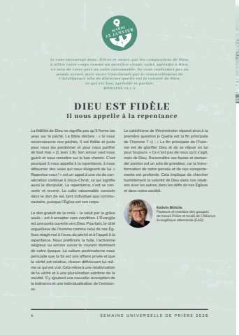 8 SEMAINE UNIVERSELLE DE PRI%u00c8RE 2026DIEU EST FID%u00c8LEIl nous appelle %u00e0 la repentanceLe cat%u00e9chisme de Westminster r%u00e9pond ainsi %u00e0 la premi%u00e8re question (%u00ab Quelle est la fin principale de l%u2019homme ? %u00bb) : %u00ab La fin principale de l%u2019homme est de glorifier Dieu et de se r%u00e9jouir en lui pour toujours. %u00bb Ce n%u2019est pas de nous qu%u2019il s%u2019agit, mais de Dieu. Reconna%u00eetre ses fautes et demander pardon est un acte de grandeur, car la transformation de notre pens%u00e9e et de nos comportements est profonde. Cela implique de chercher humblement la volont%u00e9 de Dieu dans nos relations avec les autres, dans les d%u00e9fis de nos %u00c9glises et dans notre soci%u00e9t%u00e9.La fid%u00e9lit%u00e9 de Dieu ne signifie pas qu%u2019il ferme les yeux sur le p%u00e9ch%u00e9. La Bible d%u00e9clare : %u00ab Si nous reconnaissons nos p%u00e9ch%u00e9s, il est fid%u00e8le et juste pour nous les pardonner et pour nous purifier de tout mal. %u00bb (1 Jean 1.9). Son amour veut nous gu%u00e9rir et nous remettre sur le bon chemin. C%u2019est pourquoi il nous appelle %u00e0 la repentance, %u00e0 nous d%u00e9tourner des voies qui nous %u00e9loignent de lui. %u00ab Repentez-vous ! %u00bb est un appel %u00e0 une vie de cons%u00e9cration continue %u00e0 J%u00e9sus-Christ, ce qui signifie aussi le discipulat. La repentance, c%u2019est se convertir et revenir. Le culte raisonnable consiste dans le don de soi, tant individuel que communautaire, puisque l%u2019%u00c9glise est son corps.Le don gratuit de la croix %u2013 le salut par la gr%u00e2ce seule %u2013 est %u00e0 accepter sans condition. L%u2019%u00c9vangile est une porte ouverte vers Dieu. Pourtant, le c%u00f4t%u00e9 orgueilleux de l%u2019homme comme celui de nos %u00c9glises r%u00e9agit mal %u00e0 l%u2019aveu du p%u00e9ch%u00e9 et %u00e0 l%u2019appel %u00e0 la repentance. Nous pr%u00e9f%u00e9rons la fuite, l%u2019activisme religieux ou encore suivre le courant dominant de notre %u00e9poque. La culture postmoderne nous persuade que la foi est une affaire priv%u00e9e et que la v%u00e9rit%u00e9 est relative, chacun d%u00e9finissant lui-m%u00eame ce qui est vrai. Cela m%u00e8ne %u00e0 une relativisation de la v%u00e9rit%u00e9 et %u00e0 une pluralisation extr%u00eame de la soci%u00e9t%u00e9. S%u2019y ajoutent une nouvelle conception de la tol%u00e9rance et une individualisation de l%u2019existence.Kathrin B%u00f6ttchePasteure et membre des groupesde travail Pri%u00e8re et Isra%u00ebl de l%u2019Alliance %u00e9vang%u00e9lique allemande (EAD)MARDI13 JANVIERJe vous encourage donc, fr%u00e8res et s%u0153urs, par les compassions de Dieu,%u00e0 offrir votre corps comme un sacrifice vivant, saint, agr%u00e9able %u00e0 Dieu.C e s e r a d e v o t r e p a r t u n c u l t e r a i s o n n a b l e . N e v o u s c o n f o r m e z p a s a u monde actuel, mais soyez transform%u00e9s par le renouvellement del%u2019intelligence afin de discerner quelle est la volont%u00e9 de Dieu,ce qui est bon, agr%u00e9able et parfait.ROMAINS 12.1-2