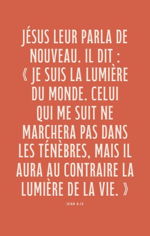 4105ESVJ%u00e9sus leur parla de nouveau. Il dit : %u00ab Je suis la lumi%u00e8re du monde. Celui qui me suit ne marchera pas dans les t%u00e9n%u00e8bres, mais il aura au contraire la lumi%u00e8re de la vie. %u00bbJEAN 8.12