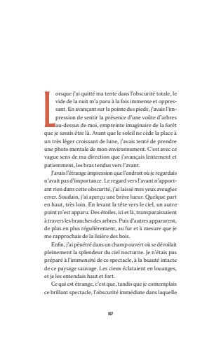 107Lorsque j%u2019ai quitt%u00e9 ma tente dans l%u2019obscurit%u00e9 totale, le vide de la nuit m%u2019a paru %u00e0 la fois immense et oppressant. En avan%u00e7ant sur la pointe des pieds, j%u2019avais l%u2019impression de sentir la pr%u00e9sence d%u2019une vo%u00fbte d%u2019arbres au-dessus de moi, empreinte imaginaire de la for%u00eat que je savais %u00eatre l%u00e0. Avant que le soleil ne c%u00e8de la place %u00e0 un tr%u00e8s l%u00e9ger croissant de lune, j%u2019avais tent%u00e9 de prendre une photo mentale de mon environnement. C%u2019est avec ce vague sens de ma direction que j%u2019avan%u00e7ais lentement et patiemment, les bras tendus vers l%u2019avant. J%u2019avais l%u2019%u00e9trange impression que l%u2019endroit o%u00f9 je regardais n%u2019avait pas d%u2019importance. Le regard vers l%u2019avant n%u2019apportant rien dans cette obscurit%u00e9, j%u2019ai laiss%u00e9 mes yeux aveugles errer. Soudain, j%u2019ai aper%u00e7u une br%u00e8ve lueur. Quelque part en haut, tr%u00e8s loin. En levant la t%u00eate vers le ciel, un autre point m%u2019est apparu. Des %u00e9toiles, ici et l%u00e0, transparaissaient %u00e0 travers les branches des arbres. Puis d%u2019autres apparurent, de plus en plus r%u00e9guli%u00e8rement, au fur et %u00e0 mesure que je me rapprochais de la lisi%u00e8re des bois. Enfin, j%u2019ai p%u00e9n%u00e9tr%u00e9 dans un champ ouvert o%u00f9 se d%u00e9voilait pleinement la splendeur du ciel nocturne. Je n%u2019%u00e9tais pas pr%u00e9par%u00e9 %u00e0 l%u2019immensit%u00e9 de ce spectacle, %u00e0 la beaut%u00e9 intacte de ce paysage sauvage. Les cieux %u00e9clataient en louanges, et je les entendais haut et fort.Ce qui est %u00e9trange, c%u2019est que, tandis que je contemplais ce brillant spectacle, l%u2019obscurit%u00e9 imm%u00e9diate dans laquelle