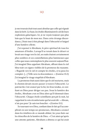 108je me trouvais %u00e9tait tout aussi absolue que celle qui r%u00e9gnait dans la for%u00eat. L%u00e0-haut, les %u00e9toiles illuminaient le ciel de leurs explosions galactiques. Ici, je ne voyais toujours pas plus loin que le bout de mon nez. Dans cette %u00e9trange discordance, j%u2019%u00e9tais tout %u00e0 fois plong%u00e9 dans l%u2019obscurit%u00e9 et baign%u00e9 d%u2019une lumi%u00e8re c%u00e9leste. J%u2019ai repens%u00e9 %u00e0 Abraham, le p%u00e8re spirituel de tous les amateurs d%u2019%u00e9toiles. Lorsqu%u2019il se tenait dans le d%u00e9sert et levait son visage vers le ciel, ses nuits %u00e9taient certainement plus sombres et ses constellations plus lumineuses que celles que nous contemplons le plus souvent aujourd%u2019hui. J%u2019ai imagin%u00e9 Dieu appelant Abraham, offrant dans le ciel bleu-noir ces signes visibles de la promesse du royaume. %u00ab Regarde vers le ciel et compte les %u00e9toiles, si tu peux les compter. [%u2026] Telle sera ta descendance. %u00bb (Gen%u00e8se 15.5) J%u2019ai imagin%u00e9 le visage stup%u00e9fait d%u2019Abraham. La promesse %u00e9tait aussi claire que le ciel nocturne, mais le chemin devait encore passer %u00e0 travers l%u2019obscurit%u00e9. Le patriarche s%u2019est avanc%u00e9 par la foi, les bras tendus, se confiant en Dieu pour diriger ses pas. Sous la lumi%u00e8re des %u00e9toiles, Abraham crut en Dieu alors qu%u2019il t%u00e2tonnait dans l%u2019obscurit%u00e9. Chaque %u00e9toile scintillante per%u00e7ait la nuit, lui rappelant la voix r%u00e9confortante qui lui avait dit : %u00ab Abram, n%u2019aie pas peur ! Je suis ton bouclier. %u00bb (Gen%u00e8se 15.1)Se tournant vers Dieu, confiant dans le fait qu%u2019il accomplirait en son temps ses promesses, Abraham a avanc%u00e9 dans les t%u00e9n%u00e8bres de ce monde ab%u00eem%u00e9, les yeux fix%u00e9s sur les %u00e9tincelles de la lumi%u00e8re de Dieu. %u00ab C%u2019est ainsi qu%u2019apr%u00e8s une attente patiente, Abraham a obtenu ce qui lui avait S 4|J 1