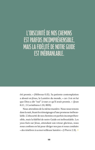 109%u00e9t%u00e9 promis. %u00bb (H%u00e9breux 6.15). Sa patiente contemplation a abouti en J%u00e9sus, la Lumi%u00e8re du monde, %u00ab car c%u2019est en lui que Dieu a dit %u201coui%u201d %u00e0 tout ce qu%u2019il avait promis. %u00bb (Jean 8.12 ; 2 Corinthiens 1.20, BDS) Nous attendons de la m%u00eame mani%u00e8re. Nous nous tenons dans la nuit, fixant les t%u00e9moignages d%u2019une promesse in%u00e9branlable. L%u2019obscurit%u00e9 de nos chemins est parfois incompr%u00e9hensible, mais la fid%u00e9lit%u00e9 de notre Guide est in%u00e9branlable. Les yeux fix%u00e9s sur J%u00e9sus, attendant son retour glorieux, nous nous confions en lui pour diriger nos pas et nous conduire %u00ab des t%u00e9n%u00e8bres %u00e0 sa merveilleuse lumi%u00e8re %u00bb (1 Pierre 2.9). L%u2019obscurit%u00e9 de nos chemins est parfois incompr%u00e9hensible, mais la fid%u00e9lit%u00e9 de notre Guide est in%u00e9branlable.