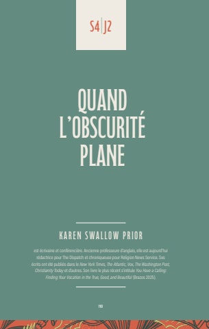 110Karen Swallow Priorest %u00e9crivaine et conf%u00e9renci%u00e8re. Ancienne professeure d%u2019anglais, elle est aujourd%u2019hui r%u00e9dactrice pour The Dispatch et chroniqueuse pour Religion News Service. Ses %u00e9crits ont %u00e9t%u00e9 publi%u00e9s dans le New York Times, The Atlantic, Vox, The Washington Post, Christianity Today et d%u2019autres. Son livre le plus r%u00e9cent s%u2019intitule You Have a Calling: Finding Your Vocation in the True, Good, and Beautiful (Brazos 2025).S4|J2Quandl%u2019obscurit%u00e9plane