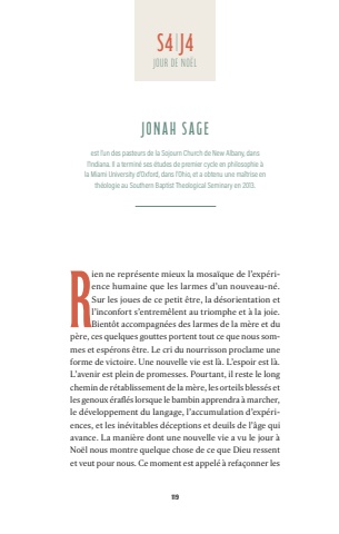 119Rien ne repr%u00e9sente mieux la mosa%u00efque de l%u2019exp%u00e9rience humaine que les larmes d%u2019un nouveau-n%u00e9. Sur les joues de ce petit %u00eatre, la d%u00e9sorientation et l%u2019inconfort s%u2019entrem%u00ealent au triomphe et %u00e0 la joie. Bient%u00f4t accompagn%u00e9es des larmes de la m%u00e8re et du p%u00e8re, ces quelques gouttes portent tout ce que nous sommes et esp%u00e9rons %u00eatre. Le cri du nourrisson proclame une forme de victoire. Une nouvelle vie est l%u00e0. L%u2019espoir est l%u00e0. L%u2019avenir est plein de promesses. Pourtant, il reste le long chemin de r%u00e9tablissement de la m%u00e8re, les orteils bless%u00e9s et les genoux %u00e9rafl%u00e9s lorsque le bambin apprendra %u00e0 marcher, le d%u00e9veloppement du langage, l%u2019accumulation d%u2019exp%u00e9riences, et les in%u00e9vitables d%u00e9ceptions et deuils de l%u2019%u00e2ge qui avance. La mani%u00e8re dont une nouvelle vie a vu le jour %u00e0 No%u00ebl nous montre quelque chose de ce que Dieu ressent et veut pour nous. Ce moment est appel%u00e9 %u00e0 refa%u00e7onner les S4|J4JOUR DE NO%u00cbLJ o n a h S a g e est l%u2019un des pasteurs de la Sojourn Church de New Albany, dans l%u2019Indiana. Il a termin%u00e9 ses %u00e9tudes de premier cycle en philosophie %u00e0 la Miami University d%u2019Oxford, dans l%u2019Ohio, et a obtenu une ma%u00eetrise en th%u00e9ologie au Southern Baptist Theological Seminary en 2013.