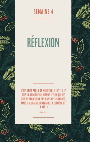 122J%u00e9sus leur parla de nouveau. Il dit : %u00ab Je suis la lumi%u00e8re du monde. Celui qui me suit ne marchera pas dans les t%u00e9n%u00e8bres, mais il aura au contraire la lumi%u00e8re de la vie. %u00bbJEAN 8.12SEMAINE 4R%u00e9flexion