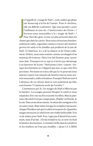 19Je l%u2019appelle le %u00ab nuage de No%u00ebl %u00bb, cette ombre qui plane sur beaucoup %u00e0 la fin de l%u2019ann%u00e9e. Pour le chr%u00e9tien, elle est difficile %u00e0 admettre. Qui veut para%u00eetre casser l%u2019ambiance le jour de %u00ab l%u2019anniversaire du Christ %u00bb ? Serions-nous insensibles %u00e0 la %u00ab magie de No%u00ebl %u00bb ? Pour bien des gens, la joie est plus pr%u00e9sente dans les chants que dans les c%u0153urs. Nous nous retrouvons %u00e9motionnellement exil%u00e9s, regardant comme %u00e0 travers des fen%u00eatres givr%u00e9es les amis et les familles qui profitent de la joie de No%u00ebl. %u00c0 l%u2019int%u00e9rieur, il y a de la chaleur et de l%u2019%u00e9merveillement. Dehors, nous nous sentons comme envelopp%u00e9s d%u2019un manteau de tristesse. Dieu s%u2019est fait homme pour sauver mon %u00e2me. Pourquoi est-ce que je n%u2019arrive pas davantage %u00e0 en %u00e9prouver de la joie ? No%u00ebl peine %u00e0 %u00eatre %u00ab joyeux %u00bb lorsque nos %u00e9motions ne s%u2019alignent pas avec ce que cette f%u00eate proclame. Personne ne nous a dit que la vie pourrait nous amener %u00e0 parer nos maisons de lumi%u00e8re tout en nous sentant maussades, exil%u00e9s et honteux. Pourquoi No%u00ebl me met-il %u00e0 distance de ces choses dont je sens justement qu%u2019elles sont bonnes ? Comment sortir de l%u2019orni%u00e8re ?Commencez par l%u00e0 : les nuages de No%u00ebl n%u2019effacent pas la lumi%u00e8re. Les nuages peuvent bloquer le soleil et nous emp%u00eacher d%u2019en voir ou d%u2019en ressentir les effets. Mais la puissance du soleil n%u2019est pas compromise. J%u2019habite en Floride. Je le sais. Nous avons deux saisons : la saison des ouragans et les six autres mois. Mais m%u00eame lorsque les temp%u00eates menacent, chaque Floridien sait que le soleil est toujours l%u00e0. Quand les nuages menacent, le soleil reste une r%u00e9alit%u00e9 in%u00e9luctable. Il en va de m%u00eame pour No%u00ebl. Il ne s%u2019agit pas d%u2019abord d%u2019un sentiment, mais d%u2019un fait. %u00ab En lui r%u00e9sidait la vie, et cette vie %u00e9tait la lumi%u00e8re des hommes. La lumi%u00e8re brille dans les t%u00e9n%u00e8bres et les t%u00e9n%u00e8bres ne l%u2019ont pas %u00e9touff%u00e9e. %u00bb (Jean 1.4-5, BDS)