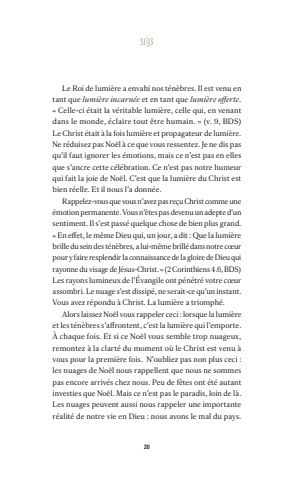 20Le Roi de lumi%u00e8re a envahi nos t%u00e9n%u00e8bres. Il est venu en tant que lumi%u00e8re incarn%u00e9e et en tant que lumi%u00e8re offerte. %u00ab Celle-ci %u00e9tait la v%u00e9ritable lumi%u00e8re, celle qui, en venant dans le monde, %u00e9claire tout %u00eatre humain. %u00bb (v. 9, BDS) Le Christ %u00e9tait %u00e0 la fois lumi%u00e8re et propagateur de lumi%u00e8re. Ne r%u00e9duisez pas No%u00ebl %u00e0 ce que vous ressentez. Je ne dis pas qu%u2019il faut ignorer les %u00e9motions, mais ce n%u2019est pas en elles que s%u2019ancre cette c%u00e9l%u00e9bration. Ce n%u2019est pas notre humeur qui fait la joie de No%u00ebl. C%u2019est que la lumi%u00e8re du Christ est bien r%u00e9elle. Et il nous l%u2019a donn%u00e9e.Rappelez-vous que vous n%u2019avez pas re%u00e7u Christ comme une %u00e9motion permanente. Vous n%u2019%u00eates pas devenu un adepte d%u2019un sentiment. Il s%u2019est pass%u00e9 quelque chose de bien plus grand. %u00ab En effet, le m%u00eame Dieu qui, un jour, a dit : Que la lumi%u00e8re brille du sein des t%u00e9n%u00e8bres, a lui-m%u00eame brill%u00e9 dans notre c%u0153ur pour y faire resplendir la connaissance de la gloire de Dieu qui rayonne du visage de J%u00e9sus-Christ. %u00bb (2 Corinthiens 4.6, BDS)Les rayons lumineux de l%u2019%u00c9vangile ont p%u00e9n%u00e9tr%u00e9 votre c%u0153ur assombri. Le nuage s%u2019est dissip%u00e9, ne serait-ce qu%u2019un instant. Vous avez r%u00e9pondu %u00e0 Christ. La lumi%u00e8re a triomph%u00e9.Alors laissez No%u00ebl vous rappeler ceci : lorsque la lumi%u00e8re et les t%u00e9n%u00e8bres s%u2019affrontent, c%u2019est la lumi%u00e8re qui l%u2019emporte. %u00c0 chaque fois. Et si ce No%u00ebl vous semble trop nuageux, remontez %u00e0 la clart%u00e9 du moment o%u00f9 le Christ est venu %u00e0 vous pour la premi%u00e8re fois. N%u2019oubliez pas non plus ceci : les nuages de No%u00ebl nous rappellent que nous ne sommes pas encore arriv%u00e9s chez nous. Peu de f%u00eates ont %u00e9t%u00e9 autant investies que No%u00ebl. Mais ce n%u2019est pas le paradis, loin de l%u00e0. Les nuages peuvent aussi nous rappeler une importante r%u00e9alit%u00e9 de notre vie en Dieu : nous avons le mal du pays.S 1|J 3