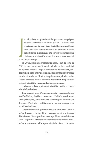 23%u2019ai v%u00e9cu dans un quartier o%u00f9 les pacaniers %u2014 qui produisent les fameuses noix de p%u00e9can %u2014 s%u2019%u00e9levaient %u00e0 trente m%u00e8tres de haut dans le ciel br%u00fblant du Texas. Avec deux dans l%u2019arri%u00e8re-cour et un %u00e0 l%u2019avant, ils dominaient notre maison avec une sorte d%u2019%u00e9l%u00e9gance royale et donnaient r%u00e9guli%u00e8rement leurs pr%u00e9cieuses noix %u00e0 la fin du printemps. En 2005, ils sont devenus %u00e9tranges. Tout au long de l%u2019%u00e9t%u00e9, ils ont commenc%u00e9 %u00e0 perdre des branches, parfois %u00e0 un rythme effr%u00e9n%u00e9. D%u2019%u00e9pais rameaux se d%u00e9tachaient, fendaient l%u2019air dans un bruit strident, puis tombaient presque sans bruit sur le sol. Tout le long de ma rue, des branches se sont %u00e9cras%u00e9es sur des voitures, des toits et des pelouses, attirant bient%u00f4t le vacarme des tron%u00e7onneuses. Les bonnes choses qui auraient d%u00fb %u00eatre solides et durables s%u2019effondraient. Il en va aussi ainsi d%u2019ann%u00e9e en ann%u00e9e : mariages bris%u00e9s par l%u2019infid%u00e9lit%u00e9, familles et quartiers d%u00e9chir%u00e9s par des tensions politiques, communaut%u00e9s ab%u00eem%u00e9es puis divis%u00e9es par des abus d%u2019autorit%u00e9, conflits arm%u00e9s, paysages ravag%u00e9s par les al%u00e9as du climat. Lorsque le monde qui nous entoure semble se d%u00e9faire, m%u00eame les plus robustes d%u2019entre nous peuvent se retrouver d%u00e9sorient%u00e9s. Nous perdons courage. Nous nous laissons aller %u00e0 l%u2019apathie. Et lorsque nous retrouvons livr%u00e9s %u00e0 nousm%u00eames, un sombre d%u00e9sespoir s%u2019installe et corrode notre