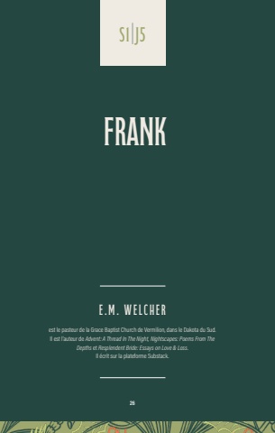 26E . M . W e l c h e r est le pasteur de la Grace Baptist Church de Vermilion, dans le Dakota du Sud. Il est l%u2019auteur de Advent: A Thread In The Night, Nightscapes: Poems From The Depths et Resplendent Bride: Essays on Love & Loss.Il %u00e9crit sur la plateforme Substack.S1|J5Frank