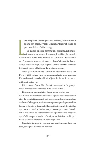 27Lorsque j%u2019avais une vingtaine d%u2019ann%u00e9es, mon fr%u00e8re m%u2019a donn%u00e9 son chien. Frank. Un cl%u00e9bard noir et blanc de quarante kilos. Collier rouge.Sa queue, %u00e9paisse comme une branche, rebondissait sans cesse contre les murs, les tibias, le monde lui-m%u00eame et votre %u00e2me. Il avait un c%u0153ur d%u2019or. Son amour se r%u00e9percutait %u00e0 travers le contreplaqu%u00e9 du mobile home que je louais %u2014 flap, flap, flap %u2014 comme le c%u0153ur de Dieu battant %u00e0 travers l%u2019histoire de la r%u00e9demption. Nous parcourions les collines et les vall%u00e9es dans ma Ford F-250 noire. Puis nous avons choisi une maison. Frank dormait dans la salle de s%u00e9jour. Le bruit de sa queue rythmait notre vie. J%u2019ai rencontr%u00e9 une fille. Frank la trouvait tr%u00e8s sympa. Nous nous sommes mari%u00e9s. Elle est d%u00e9c%u00e9d%u00e9e. L%u2019homme a une certaine fa%u00e7on de se replier sur lui-m%u00eame. Toutes les nuances de la journ%u00e9e se r%u00e9duisent %u00e0 rien de bien int%u00e9ressant %u00e0 voir, alors vous fixez le mur. Les ombres s%u2019allongent, mais vous ne prenez pas la peine d%u2019allumer la lumi%u00e8re. La poubelle contient plus de bouteilles que vous ne voulez l%u2019admettre, et vous apercevez dans le reflet des vitres de votre voiture des poches sous vos yeux qui r%u00e9v%u00e8lent que la seule rh%u00e9torique de la foi ne suffit pas. Vous allumez la t%u00e9l%u00e9vision pour l%u2019ignorer.J%u2019en %u00e9tais l%u00e0, assis %u00e0 regarder des rediffusions dans ma t%u00eate, sans plus d%u2019amour %u00e0 donner.
