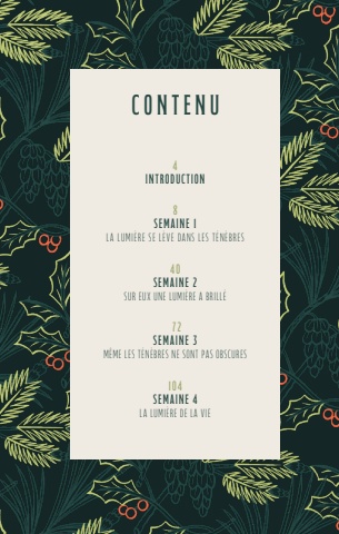 34Introduction8S E M A I N E 1 La lumi%u00e8re se l%u00e8ve dans les t%u00e9n%u00e8bres4 0SEMAINE 2Sur eux une lumi%u00e8re a brill%u00e97 2SEMAINE 3M%u00eame les t%u00e9n%u00e8bres ne sont pas obscures104SEMAINE 4La lumi%u00e8re de la vieCONTENU