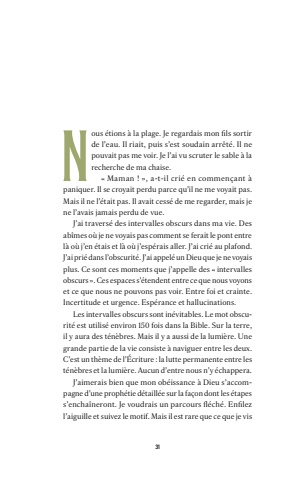 31N ous %u00e9tions %u00e0 la plage. Je regardais mon fils sortir de l%u2019eau. Il riait, puis s%u2019est soudain arr%u00eat%u00e9. Il ne pouvait pas me voir. Je l%u2019ai vu scruter le sable %u00e0 la recherche de ma chaise.%u00ab Maman ! %u00bb, a-t-il cri%u00e9 en commen%u00e7ant %u00e0 paniquer. Il se croyait perdu parce qu%u2019il ne me voyait pas. Mais il ne l%u2019%u00e9tait pas. Il avait cess%u00e9 de me regarder, mais je ne l%u2019avais jamais perdu de vue. J%u2019ai travers%u00e9 des intervalles obscurs dans ma vie. Des ab%u00eemes o%u00f9 je ne voyais pas comment se ferait le pont entre l%u00e0 o%u00f9 j%u2019en %u00e9tais et l%u00e0 o%u00f9 j%u2019esp%u00e9rais aller. J%u2019ai cri%u00e9 au plafond. J%u2019ai pri%u00e9 dans l%u2019obscurit%u00e9. J%u2019ai appel%u00e9 un Dieu que je ne voyais plus. Ce sont ces moments que j%u2019appelle des %u00ab intervalles obscurs %u00bb. Ces espaces s%u2019%u00e9tendent entre ce que nous voyons et ce que nous ne pouvons pas voir. Entre foi et crainte. Incertitude et urgence. Esp%u00e9rance et hallucinations. Les intervalles obscurs sont in%u00e9vitables. Le mot obscurit%u00e9 est utilis%u00e9 environ 150 fois dans la Bible. Sur la terre, il y aura des t%u00e9n%u00e8bres. Mais il y a aussi de la lumi%u00e8re. Une grande partie de la vie consiste %u00e0 naviguer entre les deux. C%u2019est un th%u00e8me de l%u2019%u00c9criture : la lutte permanente entre les t%u00e9n%u00e8bres et la lumi%u00e8re. Aucun d%u2019entre nous n%u2019y %u00e9chappera. J%u2019aimerais bien que mon ob%u00e9issance %u00e0 Dieu s%u2019accompagne d%u2019une proph%u00e9tie d%u00e9taill%u00e9e sur la fa%u00e7on dont les %u00e9tapes s%u2019encha%u00eeneront. Je voudrais un parcours fl%u00e9ch%u00e9. Enfilezl%u2019aiguille et suivez le motif. Mais il est rare que ce que je vis