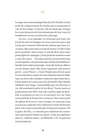 36Lorsque nous %u00e9tions plong%u00e9s dans Jean 10, Natalie m%u2019avait parl%u00e9 du comportement des brebis qui reconnaissent la voix de leur berger. %u00c0 pr%u00e9sent, elle me disait que, lorsque les veaux d%u00e9couvrent le fonctionnement de leur corps, ils bondissent en tous sens dans leur p%u00e2turage. %u00ab Je vois %u00bb, ai-je r%u00e9pondu. Ce n%u2019%u00e9tait pas tout %u00e0 fait vrai. J%u2019avais du mal %u00e0 m%u2019imaginer la sc%u00e8ne, peut-%u00eatre parce que la joie qui en %u00e9manait d%u00e9tonait du moment que nous traversions. Mon amie %u00e9tait en train de mourir. Et elle n%u2019%u00e9tait pas la premi%u00e8re. Nous avions vu tant de d%u00e9c%u00e8s dans notre petite %u00e9glise de campagne. J%u2019avais perdu de nombreux amis %u00e0 cause du cancer %u2014 de jeunes parents, des personnes que j%u2019avais baptis%u00e9es, des personnes que j%u2019aimais profond%u00e9ment. Natalie %u00e9tait relativement %u00e2g%u00e9e, mais elle %u00e9tait par ailleurs en tr%u00e8s bonne sant%u00e9. Elle aussi s%u2019appr%u00eatait clairement %u00e0 partir %u00ab avant l%u2019heure %u00bb. J%u2019avais l%u2019impression d%u2019avoir pass%u00e9 les trois derni%u00e8res ann%u00e9es de mon minist%u00e8re dans les h%u00f4pitaux, au chevet des malades et dans les salons fun%u00e9raires. J%u2019%u00e9tais %u00e9puis%u00e9. Je n%u2019avais pas envie de bondir. Mais Natalie m%u00e9ditait cette image. Aussi p%u00e9nible que soit devenue sa vie, elle continuait %u00e0 parler de voir J%u00e9sus. Tous les autres se pr%u00e9paraient pour No%u00ebl, mais elle se pr%u00e9occupait de J%u00e9sus. Elle se pr%u00e9parait au ciel et %u00e0 sa rencontre avec lui. Nous avons parl%u00e9 de la beaut%u00e9 de ce moment. Nous avons parl%u00e9 des gloires de la terre %u00e0 venir, lorsque ces corps que nous ne pouvons emp%u00eacher de se d%u00e9t%u00e9riorer feront finalement place %u00e0 des corps renouvel%u00e9s qui vivront pour toujours. Par la gr%u00e2ce de Dieu, ce n%u2019%u00e9taient pas seulement les couvertures qui tenaient Natalie au chaud ; c%u2019%u00e9tait son esp%u00e9rance dans le %u00ab soleil de justice %u00bb de Malachie 3.20. Sa gu%u00e9rison %u00e9tait imminente. S 1|J 7
