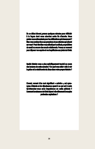 En ce d%u00e9but d%u2019avent, prenez quelques minutes pour r%u00e9fl%u00e9chir %u00e0 la fa%u00e7on dont vous abordez cette fin d%u2019ann%u00e9e. Voussentez-vous enthousiaste pour les c%u00e9l%u00e9brations qui s%u2019annoncent ?%u00cates-vous anxieux face aux pressions et aux attentes qui p%u00e8sent sur vous? Peut-%u00eatre %u00eates-vous affect%u00e9 par la solitude, un probl%u00e8me de sant%u00e9 ou encore des soucis relationnels. Prenez un moment pour d%u00e9poser vos espoirs et vos inqui%u00e9tudes aux pieds du Christ.Quelle histoire vous a plus sp%u00e9cifiquement touch%u00e9 au cours des lectures de cette semaine ? En quoi vous aide-t-elle %u00e0 voir la gr%u00e2ce et la mis%u00e9ricorde de J%u00e9sus dans votre propre histoire ?L%u2019avent, venant d%u2019un mot signifiant %u00ab arriv%u00e9e %u00bb, est synonyme d%u2019attente et de r%u00e9jouissance quant %u00e0 ce qui est %u00e0 venir.Qu%u2019attendez-vous avec impatience en cette p%u00e9riode ?Comment la naissance de Christ r%u00e9pond-elle ultimement %u00e0 nos plusprofondes aspirations ?39