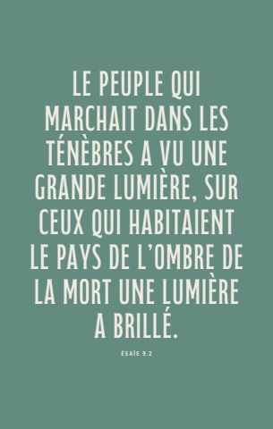 41Le peuple qui marchait dans les t%u00e9n%u00e8bres a vu une grande lumi%u00e8re, sur ceux qui habitaient le pays de l%u2019ombre de la mort une lumi%u00e8re a brill%u00e9.%u00c9SA%u00cfE 9.2