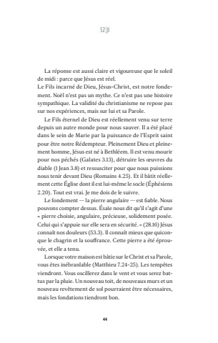 44La r%u00e9ponse est aussi claire et vigoureuse que le soleil de midi : parce que J%u00e9sus est r%u00e9el.Le Fils incarn%u00e9 de Dieu, J%u00e9sus-Christ, est notre fondement. No%u00ebl n%u2019est pas un mythe. Ce n%u2019est pas une histoire sympathique. La validit%u00e9 du christianisme ne repose pas sur nos exp%u00e9riences, mais sur lui et sa Parole. Le Fils %u00e9ternel de Dieu est r%u00e9ellement venu sur terre depuis un autre monde pour nous sauver. Il a %u00e9t%u00e9 plac%u00e9 dans le sein de Marie par la puissance de l%u2019Esprit saint pour %u00eatre notre R%u00e9dempteur. Pleinement Dieu et pleinement homme, J%u00e9sus est n%u00e9 %u00e0 Bethl%u00e9em. Il est venu mourir pour nos p%u00e9ch%u00e9s (Galates 3.13), d%u00e9truire les %u0153uvres du diable (1 Jean 3.8) et ressusciter pour que nous puissions nous tenir devant Dieu (Romains 4.25). Et il b%u00e2tit r%u00e9ellement cette %u00c9glise dont il est lui-m%u00eame le socle (%u00c9ph%u00e9siens 2.20). Tout est vrai. Je me dois de le suivre.Le fondement %u2014 la pierre angulaire %u2014 est fiable. Nous pouvons compter dessus. %u00c9sa%u00efe nous dit qu%u2019il s%u2019agit d%u2019une %u00ab pierre choisie, angulaire, pr%u00e9cieuse, solidement pos%u00e9e. Celui qui s%u2019appuie sur elle sera en s%u00e9curit%u00e9. %u00bb (28.16) J%u00e9sus conna%u00eet nos douleurs (53.3). Il conna%u00eet mieux que quiconque le chagrin et la souffrance. Cette pierre a %u00e9t%u00e9 %u00e9prouv%u00e9e, et elle a tenu.Lorsque votre maison est b%u00e2tie sur le Christ et sa Parole, vous %u00eates in%u00e9branlable (Matthieu 7.24-25). Les temp%u00eates viendront. Vous oscillerez dans le vent et vous serez battus par la pluie. Un nouveau toit, de nouveaux murs et un nouveau rev%u00eatement de sol pourraient %u00eatre n%u00e9cessaires, mais les fondations tiendront bon.S 2|J 1