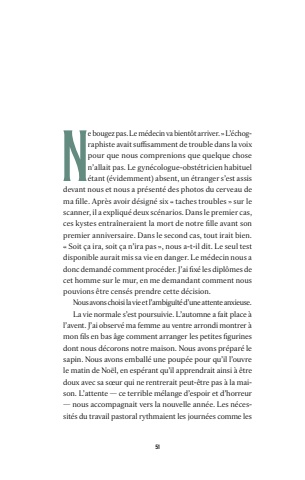 51Ne bougez pas. Le m%u00e9decin va bient%u00f4t arriver. %u00bb L%u2019%u00e9chographiste avait suffisamment de trouble dans la voix pour que nous comprenions que quelque chose n%u2019allait pas. Le gyn%u00e9cologue-obst%u00e9tricien habituel %u00e9tant (%u00e9videmment) absent, un %u00e9tranger s%u2019est assis devant nous et nous a pr%u00e9sent%u00e9 des photos du cerveau de ma fille. Apr%u00e8s avoir d%u00e9sign%u00e9 six %u00ab taches troubles %u00bb sur le scanner, il a expliqu%u00e9 deux sc%u00e9narios. Dans le premier cas, ces kystes entra%u00eeneraient la mort de notre fille avant son premier anniversaire. Dans le second cas, tout irait bien. %u00ab Soit %u00e7a ira, soit %u00e7a n%u2019ira pas %u00bb, nous a-t-il dit. Le seul test disponible aurait mis sa vie en danger. Le m%u00e9decin nous a donc demand%u00e9 comment proc%u00e9der. J%u2019ai fix%u00e9 les dipl%u00f4mes de cet homme sur le mur, en me demandant comment nous pouvions %u00eatre cens%u00e9s prendre cette d%u00e9cision. Nous avons choisi la vie et l%u2019ambigu%u00eft%u00e9 d%u2019une attente anxieuse. La vie normale s%u2019est poursuivie. L%u2019automne a fait place %u00e0 l%u2019avent. J%u2019ai observ%u00e9 ma femme au ventre arrondi montrer %u00e0 mon fils en bas %u00e2ge comment arranger les petites figurines dont nous d%u00e9corons notre maison. Nous avons pr%u00e9par%u00e9 le sapin. Nous avons emball%u00e9 une poup%u00e9e pour qu%u2019il l%u2019ouvre le matin de No%u00ebl, en esp%u00e9rant qu%u2019il apprendrait ainsi %u00e0 %u00eatre doux avec sa s%u0153ur qui ne rentrerait peut-%u00eatre pas %u00e0 la maison. L%u2019attente %u2014 ce terrible m%u00e9lange d%u2019espoir et d%u2019horreur %u2014 nous accompagnait vers la nouvelle ann%u00e9e. Les n%u00e9cessit%u00e9s du travail pastoral rythmaient les journ%u00e9es comme les