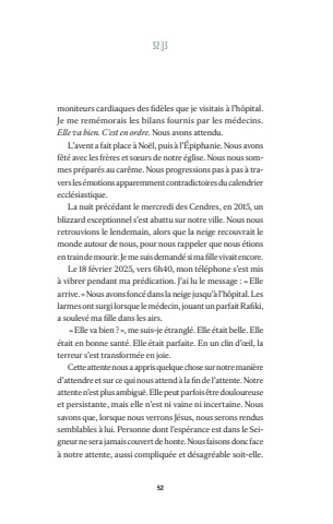 52moniteurs cardiaques des fid%u00e8les que je visitais %u00e0 l%u2019h%u00f4pital. Je me rem%u00e9morais les bilans fournis par les m%u00e9decins.Elle va bien. C%u2019est en ordre. Nous avons attendu. L%u2019avent a fait place %u00e0 No%u00ebl, puis %u00e0 l%u2019%u00c9piphanie. Nous avons f%u00eat%u00e9 avec les fr%u00e8res et s%u0153urs de notre %u00e9glise. Nous nous sommes pr%u00e9par%u00e9s au car%u00eame. Nous progressions pas %u00e0 pas %u00e0 travers les %u00e9motions apparemment contradictoires du calendrier eccl%u00e9siastique. La nuit pr%u00e9c%u00e9dant le mercredi des Cendres, en 2015, un blizzard exceptionnel s%u2019est abattu sur notre ville. Nous nous retrouvions le lendemain, alors que la neige recouvrait le monde autour de nous, pour nous rappeler que nous %u00e9tions en train de mourir. Je me suis demand%u00e9 si ma fille vivait encore. Le 18 f%u00e9vrier 2025, vers 6h40, mon t%u00e9l%u00e9phone s%u2019est mis %u00e0 vibrer pendant ma pr%u00e9dication. J%u2019ai lu le message : %u00ab Elle arrive. %u00bb Nous avons fonc%u00e9 dans la neige jusqu%u2019%u00e0 l%u2019h%u00f4pital. Les larmes ont surgi lorsque le m%u00e9decin, jouant un parfait Rafiki, a soulev%u00e9 ma fille dans les airs. %u00ab Elle va bien ? %u00bb, me suis-je %u00e9trangl%u00e9. Elle %u00e9tait belle. Elle %u00e9tait en bonne sant%u00e9. Elle %u00e9tait parfaite. En un clin d%u2019%u0153il, la terreur s%u2019est transform%u00e9e en joie. Cette attente nous a appris quelque chose sur notre mani%u00e8re d%u2019attendre et sur ce qui nous attend %u00e0 la fin de l%u2019attente. Notre attente n%u2019est plus ambigu%u00eb. Elle peut parfois %u00eatre douloureuse et persistante, mais elle n%u2019est ni vaine ni incertaine. Nous savons que, lorsque nous verrons J%u00e9sus, nous serons rendus semblables %u00e0 lui. Personne dont l%u2019esp%u00e9rance est dans le Seigneur ne sera jamais couvert de honte. Nous faisons donc face %u00e0 notre attente, aussi compliqu%u00e9e et d%u00e9sagr%u00e9able soit-elle. S 2|J 3