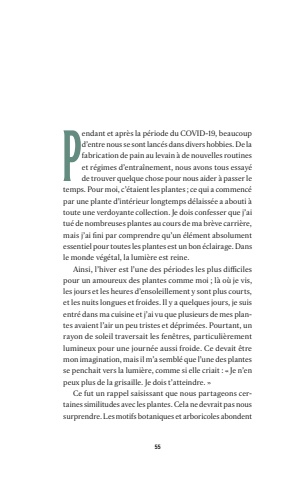 55Pendant et apr%u00e8s la p%u00e9riode du COVID-19, beaucoup d%u2019entre nous se sont lanc%u00e9s dans divers hobbies. De la fabrication de pain au levain %u00e0 de nouvelles routines et r%u00e9gimes d%u2019entra%u00eenement, nous avons tous essay%u00e9 de trouver quelque chose pour nous aider %u00e0 passer le temps. Pour moi, c%u2019%u00e9taient les plantes ; ce qui a commenc%u00e9 par une plante d%u2019int%u00e9rieur longtemps d%u00e9laiss%u00e9e a abouti %u00e0 toute une verdoyante collection. Je dois confesser que j%u2019ai tu%u00e9 de nombreuses plantes au cours de ma br%u00e8ve carri%u00e8re, mais j%u2019ai fini par comprendre qu%u2019un %u00e9l%u00e9ment absolument essentiel pour toutes les plantes est un bon %u00e9clairage. Dans le monde v%u00e9g%u00e9tal, la lumi%u00e8re est reine.Ainsi, l%u2019hiver est l%u2019une des p%u00e9riodes les plus difficiles pour un amoureux des plantes comme moi ; l%u00e0 o%u00f9 je vis, les jours et les heures d%u2019ensoleillement y sont plus courts, et les nuits longues et froides. Il y a quelques jours, je suis entr%u00e9 dans ma cuisine et j%u2019ai vu que plusieurs de mes plantes avaient l%u2019air un peu tristes et d%u00e9prim%u00e9es. Pourtant, un rayon de soleil traversait les fen%u00eatres, particuli%u00e8rement lumineux pour une journ%u00e9e aussi froide. Ce devait %u00eatre mon imagination, mais il m%u2019a sembl%u00e9 que l%u2019une des plantes se penchait vers la lumi%u00e8re, comme si elle criait : %u00ab Je n%u2019en peux plus de la grisaille. Je dois t%u2019atteindre. %u00bbCe fut un rappel saisissant que nous partageons certaines similitudes avec les plantes. Cela ne devrait pas nous surprendre. Les motifs botaniques et arboricoles abondent