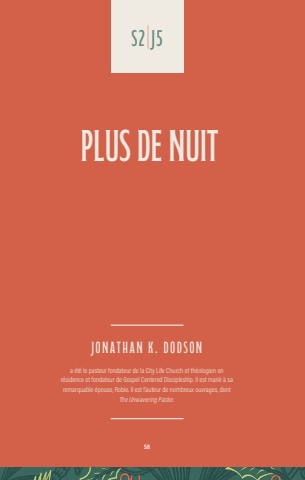 58J o n a t h a n K . D o d s o n a %u00e9t%u00e9 le pasteur fondateur de la City Life Church et th%u00e9ologien en r%u00e9sidence et fondateur de Gospel Centered Discipleship. Il est mari%u00e9 %u00e0 sa remarquable %u00e9pouse, Robie. Il est l%u2019auteur de nombreux ouvrages, dont The Unwavering Pastor. S2|J5Plus de nuit