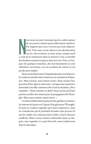 59Nous avons un jour remarqu%u00e9 que les cadres autour de nos portes %u00e9taient particuli%u00e8rement sombres. J%u2019ai suppos%u00e9 que nous n%u2019avions pas assez d%u00e9poussi%u00e9r%u00e9. Puis nous avons observ%u00e9 une d%u00e9coloration sur les sols en b%u00e9ton, et nous avons compris qu%u2019il y avait de la moisissure dans la maison ! Cela a entra%u00een%u00e9 des bouleversements majeurs dans nos vies. Puis, en l%u2019espace de quelques semaines, des investissements se sont effondr%u00e9s, ma femme a eu un accident de voiture et j%u2019ai perdu mon emploi.Nous avons lutt%u00e9 contre l%u2019inqui%u00e9tude pour nos finances, la crainte de perdre notre maison et un sentiment d%u2019injustice. Mais surtout, nous %u00e9tions tristes. Nous avions l%u2019impression d%u2019%u00eatre dans la nuit noire. Lorsque notre pasteur a demand%u00e9 %u00e0 ma fille comment elle vivait la situation, elle a r%u00e9pondu : %u00ab Nous sommes en deuil. Nous savons qu%u2019il faut parfois sacrifier des choses pour la propagation de l%u2019%u00c9vangile. Mais nous sommes aussi tristes. %u00bbCes deux r%u00e9alit%u00e9s doivent pouvoir %u00eatre gard%u00e9es en tension : la tristesse de la perte et l%u2019espoir d%u2019un gain pour l%u2019%u00c9vangile. Si nous ne voulons regarder qu%u2019%u00e0 notre esp%u00e9rance, nous ne conna%u00eetrons pas le profond r%u00e9confort que procure le fait de confier nos tristesses bien r%u00e9elles %u00e0 notre Sauveur souffrant. Mais si nous restons embourb%u00e9s dans ce chagrin, sans regarder %u00e0 ce que Dieu fait, nous sombrerons dans le d%u00e9sespoir.