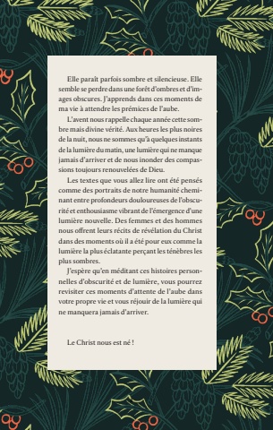 6Elle para%u00eet parfois sombre et silencieuse. Elle semble se perdre dans une for%u00eat d%u2019ombres et d%u2019images obscures. J%u2019apprends dans ces moments de ma vie %u00e0 attendre les pr%u00e9mices de l%u2019aube. L%u2019avent nous rappelle chaque ann%u00e9e cette sombre mais divine v%u00e9rit%u00e9. Aux heures les plus noires de la nuit, nous ne sommes qu%u2019%u00e0 quelques instants de la lumi%u00e8re du matin, une lumi%u00e8re qui ne manque jamais d%u2019arriver et de nous inonder des compassions toujours renouvel%u00e9es de Dieu. Les textes que vous allez lire ont %u00e9t%u00e9 pens%u00e9s comme des portraits de notre humanit%u00e9 cheminant entre profondeurs douloureuses de l%u2019obscurit%u00e9 et enthousiasme vibrant de l%u2019%u00e9mergence d%u2019une lumi%u00e8re nouvelle. Des femmes et des hommes nous offrent leurs r%u00e9cits de r%u00e9v%u00e9lation du Christ dans des moments o%u00f9 il a %u00e9t%u00e9 pour eux comme la lumi%u00e8re la plus %u00e9clatante per%u00e7ant les t%u00e9n%u00e8bres les plus sombres. J%u2019esp%u00e8re qu%u2019en m%u00e9ditant ces histoires personnelles d%u2019obscurit%u00e9 et de lumi%u00e8re, vous pourrez revisiter ces moments d%u2019attente de l%u2019aube dans votre propre vie et vous r%u00e9jouir de la lumi%u00e8re qui ne manquera jamais d%u2019arriver.Le Christ nous est n%u00e9 !