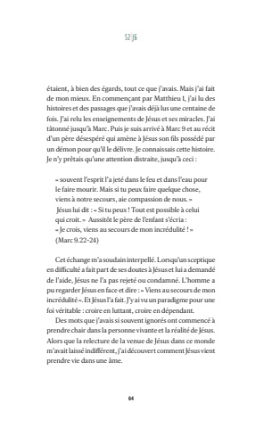 64%u00e9taient, %u00e0 bien des %u00e9gards, tout ce que j%u2019avais. Mais j%u2019ai fait de mon mieux. En commen%u00e7ant par Matthieu 1, j%u2019ai lu des histoires et des passages que j%u2019avais d%u00e9j%u00e0 lus une centaine de fois. J%u2019ai relu les enseignements de J%u00e9sus et ses miracles. J%u2019ai t%u00e2tonn%u00e9 jusqu%u2019%u00e0 Marc. Puis je suis arriv%u00e9 %u00e0 Marc 9 et au r%u00e9cit d%u2019un p%u00e8re d%u00e9sesp%u00e9r%u00e9 qui am%u00e8ne %u00e0 J%u00e9sus son fils poss%u00e9d%u00e9 par un d%u00e9mon pour qu%u2019il le d%u00e9livre. Je connaissais cette histoire. Je n%u2019y pr%u00eatais qu%u2019une attention distraite, jusqu%u2019%u00e0 ceci : %u00ab souvent l%u2019esprit l%u2019a jet%u00e9 dans le feu et dans l%u2019eau pour le faire mourir. Mais si tu peux faire quelque chose, viens %u00e0 notre secours, aie compassion de nous. %u00bb J%u00e9sus lui dit : %u00ab Si tu peux ! Tout est possible %u00e0 celuiqui croit. %u00bb Aussit%u00f4t le p%u00e8re de l%u2019enfant s%u2019%u00e9cria :%u00ab Je crois, viens au secours de mon incr%u00e9dulit%u00e9 ! %u00bb (Marc 9.22-24) Cet %u00e9change m%u2019a soudain interpell%u00e9. Lorsqu%u2019un sceptique en difficult%u00e9 a fait part de ses doutes %u00e0 J%u00e9sus et lui a demand%u00e9 de l%u2019aide, J%u00e9sus ne l%u2019a pas rejet%u00e9 ou condamn%u00e9. L%u2019homme a pu regarder J%u00e9sus en face et dire : %u00ab Viens au secours de mon incr%u00e9dulit%u00e9 %u00bb. Et J%u00e9sus l%u2019a fait. J%u2019y ai vu un paradigme pour une foi v%u00e9ritable : croire en luttant, croire en d%u00e9pendant. Des mots que j%u2019avais si souvent ignor%u00e9s ont commenc%u00e9 %u00e0 prendre chair dans la personne vivante et la r%u00e9alit%u00e9 de J%u00e9sus. Alors que la relecture de la venue de J%u00e9sus dans ce monde m%u2019avait laiss%u00e9 indiff%u00e9rent, j%u2019ai d%u00e9couvert comment J%u00e9sus vient prendre vie dans une %u00e2me. S 2|J 6