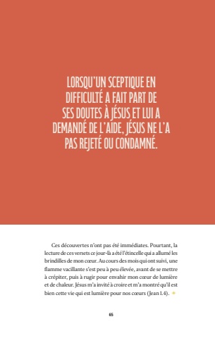65Ces d%u00e9couvertes n%u2019ont pas %u00e9t%u00e9 imm%u00e9diates. Pourtant, la lecture de ces versets ce jour-l%u00e0 a %u00e9t%u00e9 l%u2019%u00e9tincelle qui a allum%u00e9 les brindilles de mon c%u0153ur. Au cours des mois qui ont suivi, une flamme vacillante s%u2019est peu %u00e0 peu %u00e9lev%u00e9e, avant de se mettre %u00e0 cr%u00e9piter, puis %u00e0 rugir pour envahir mon c%u0153ur de lumi%u00e8re et de chaleur. J%u00e9sus m%u2019a invit%u00e9 %u00e0 croire et m%u2019a montr%u00e9 qu%u2019il est bien cette vie qui est lumi%u00e8re pour nos c%u0153urs (Jean 1.4). Lorsqu%u2019un sceptique en difficult%u00e9 a fait part de ses doutes %u00e0 J%u00e9sus et lui a demand%u00e9 de l%u2019aide, J%u00e9sus ne l%u2019a pas rejet%u00e9 ou condamn%u00e9.