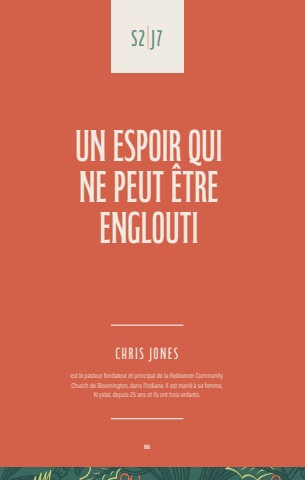 66C h r i s J o n e s est le pasteur fondateur et principal de la Redeemer Community Church de Bloomington, dans l%u2019Indiana. Il est mari%u00e9 %u00e0 sa femme, Krystal, depuis 25 ans et ils ont trois enfants.S2|J7Un espoir quine peut %u00eatreenglouti