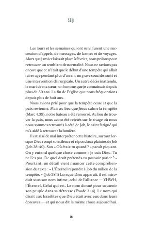76Les jours et les semaines qui ont suivi furent une succession d%u2019appels, de messages, de larmes et de voyages. Alors que janvier laissait place %u00e0 f%u00e9vrier, nous priions pour retrouver un semblant de normalit%u00e9. Nous ne savions pas encore que ce n%u2019%u00e9tait que le d%u00e9but d%u2019une temp%u00eate qui allait faire rage pendant plus d%u2019un an : un grave souci de sant%u00e9 et une intervention chirurgicale. Un autre d%u00e9c%u00e8s inattendu, le mari de ma s%u0153ur, un homme que je connaissais depuis plus de 30 ans. La fin de l%u2019%u00e9glise que nous fr%u00e9quentions depuis plus de huit ans. Nous avions pri%u00e9 pour que la temp%u00eate cesse et que la paix revienne. Mais au lieu que J%u00e9sus calme la temp%u00eate (Marc 4.39), notre bateau a %u00e9t%u00e9 renvers%u00e9. Au lieu de trouver la paix, nous avons %u00e9t%u00e9 rejet%u00e9s sur le rivage o%u00f9 nous nous sommes retrouv%u00e9s %u00e0 c%u00f4t%u00e9 de Job, le saint fatigu%u00e9 qui m%u2019a aid%u00e9 %u00e0 retrouver la lumi%u00e8re.Il est ais%u00e9 de mal interpr%u00e9ter cette histoire, surtout lorsque Dieu rompt son silence et r%u00e9pond aux plaintes de Job (Job 38-40). Son %u00ab O%u00f9 %u00e9tais-tu quand ? %u00bb para%u00eet piquant. On y entend quelque chose comme %u00ab Je suis Dieu. Tu ne l%u2019es pas. De quel droit pr%u00e9tends-tu pouvoir parler ? %u00bb Pourtant, un d%u00e9tail vient nuancer cette compr%u00e9hension du texte : %u00ab L%u2019%u00c9ternel r%u00e9pondit %u00e0 Job du milieu de la temp%u00eate. %u00bb (Job 38.1) Lorsque Dieu appara%u00eet, il est introduit sous son nom intime, celui de l%u2019alliance %u2014 YHWH, l%u2019%u00c9ternel, Celui qui est. Le nom donn%u00e9 pour soutenir son peuple dans sa d%u00e9tresse (Exode 3.14). Le nom qui disait aux Isra%u00e9lites que Dieu %u00e9tait avec eux dans leurs %u00e9preuves %u2014 et qui nous dit la m%u00eame chose aujourd%u2019hui. S 3|J 1