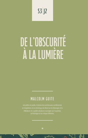 78M a l c o l m G u i t e est pr%u00eatre et po%u00e8te, il donne de nombreuses conf%u00e9rences en Angleterre et en Am%u00e9rique du Nord sur la th%u00e9ologie et la litt%u00e9rature et a publi%u00e9 plusieurs ouvrages sur la po%u00e9sie,la th%u00e9ologie et la critique litt%u00e9raire.S3|J2De l%u2019obscurit%u00e9%u00e0 la lumi%u00e8re