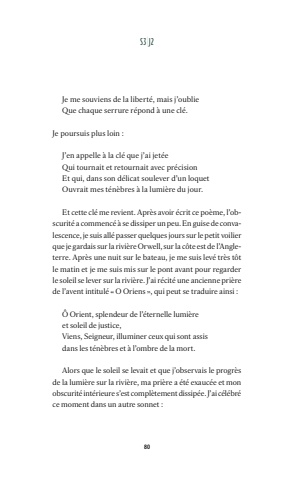 80Je me souviens de la libert%u00e9, mais j%u2019oublieQue chaque serrure r%u00e9pond %u00e0 une cl%u00e9.Je poursuis plus loin :J%u2019en appelle %u00e0 la cl%u00e9 que j%u2019ai jet%u00e9eQui tournait et retournait avec pr%u00e9cisionEt qui, dans son d%u00e9licat soulever d%u2019un loquetOuvrait mes t%u00e9n%u00e8bres %u00e0 la lumi%u00e8re du jour.Et cette cl%u00e9 me revient. Apr%u00e8s avoir %u00e9crit ce po%u00e8me, l%u2019obscurit%u00e9 a commenc%u00e9 %u00e0 se dissiper un peu. En guise de convalescence, je suis all%u00e9 passer quelques jours sur le petit voilier que je gardais sur la rivi%u00e8re Orwell, sur la c%u00f4te est de l%u2019Angleterre. Apr%u00e8s une nuit sur le bateau, je me suis lev%u00e9 tr%u00e8s t%u00f4t le matin et je me suis mis sur le pont avant pour regarder le soleil se lever sur la rivi%u00e8re. J%u2019ai r%u00e9cit%u00e9 une ancienne pri%u00e8re de l%u2019avent intitul%u00e9 %u00ab O Oriens %u00bb, qui peut se traduire ainsi :%u00d4 Orient, splendeur de l%u2019%u00e9ternelle lumi%u00e8reet soleil de justice, Viens, Seigneur, illuminer ceux qui sont assisdans les t%u00e9n%u00e8bres et %u00e0 l%u2019ombre de la mort.Alors que le soleil se levait et que j%u2019observais le progr%u00e8s de la lumi%u00e8re sur la rivi%u00e8re, ma pri%u00e8re a %u00e9t%u00e9 exauc%u00e9e et mon obscurit%u00e9 int%u00e9rieure s%u2019est compl%u00e8tement dissip%u00e9e. J%u2019ai c%u00e9l%u00e9br%u00e9 ce moment dans un autre sonnet :S 3|J 2