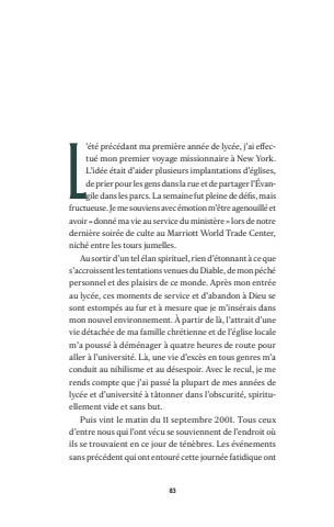 83L%u2019%u00e9t%u00e9 pr%u00e9c%u00e9dant ma premi%u00e8re ann%u00e9e de lyc%u00e9e, j%u2019ai effectu%u00e9 mon premier voyage missionnaire %u00e0 New York. L%u2019id%u00e9e %u00e9tait d%u2019aider plusieurs implantations d%u2019%u00e9glises, de prier pour les gens dans la rue et de partager l%u2019%u00c9vangile dans les parcs. La semaine fut pleine de d%u00e9fis, mais fructueuse. Je me souviens avec %u00e9motion m%u2019%u00eatre agenouill%u00e9 et avoir %u00ab donn%u00e9 ma vie au service du minist%u00e8re %u00bb lors de notre derni%u00e8re soir%u00e9e de culte au Marriott World Trade Center, nich%u00e9 entre les tours jumelles.Au sortir d%u2019un tel %u00e9lan spirituel, rien d%u2019%u00e9tonnant %u00e0 ce que s%u2019accroissent les tentations venues du Diable, de mon p%u00e9ch%u00e9 personnel et des plaisirs de ce monde. Apr%u00e8s mon entr%u00e9e au lyc%u00e9e, ces moments de service et d%u2019abandon %u00e0 Dieu se sont estomp%u00e9s au fur et %u00e0 mesure que je m%u2019ins%u00e9rais dans mon nouvel environnement. %u00c0 partir de l%u00e0, l%u2019attrait d%u2019une vie d%u00e9tach%u00e9e de ma famille chr%u00e9tienne et de l%u2019%u00e9glise locale m%u2019a pouss%u00e9 %u00e0 d%u00e9m%u00e9nager %u00e0 quatre heures de route pour aller %u00e0 l%u2019universit%u00e9. L%u00e0, une vie d%u2019exc%u00e8s en tous genres m%u2019a conduit au nihilisme et au d%u00e9sespoir. Avec le recul, je me rends compte que j%u2019ai pass%u00e9 la plupart de mes ann%u00e9es de lyc%u00e9e et d%u2019universit%u00e9 %u00e0 t%u00e2tonner dans l%u2019obscurit%u00e9, spirituellement vide et sans but. Puis vint le matin du 11 septembre 2001. Tous ceux d%u2019entre nous qui l%u2019ont v%u00e9cu se souviennent de l%u2019endroit o%u00f9 ils se trouvaient en ce jour de t%u00e9n%u00e8bres. Les %u00e9v%u00e9nements sans pr%u00e9c%u00e9dent qui ont entour%u00e9 cette journ%u00e9e fatidique ont