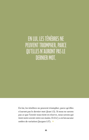 85En lui, les t%u00e9n%u00e8bres ne peuvent triompher, parce qu%u2019elles n%u2019auront pas le dernier mot (Jean 1.5). Si nous ne savons pas ce que l%u2019avenir nous tient en r%u00e9serve, nous savons qui tient notre avenir entre ses mains. Et il n%u2019y a en lui aucune ombre de variation (Jacques 1.17). En lui, les t%u00e9n%u00e8bres ne peuvent triompher, parce qu%u2019elles n%u2019auront pas le dernier mot.