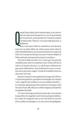 87Quand j%u2019%u00e9tais enfant, t%u00f4t le samedi matin, je me retrouvais avec des amis du quartier et, avec la permission de nos parents, nous prenions le tramway jusqu%u2019%u00e0 l%u2019Ambassador Theatre %u00e0 Gwynn Oak Junction, %u00e0 Baltimore. Juste avant que le film ne commence, nous devionstraverser un %u00e9pais rideau de velours pour entrer dans la salle. Imm%u00e9diatement, nous nous heurtions %u00e0 la rang%u00e9e du fond. Ce n%u2019est qu%u2019une fois que nos yeux s%u2019%u00e9taient adapt%u00e9s %u00e0 l%u2019obscurit%u00e9 que nous pouvions trouver nos places.Une fois le film termin%u00e9, il n%u2019y avait pas non plus de vestibule pour faire la transition entre l%u2019obscurit%u00e9 de la salle et la lumi%u00e8re du jour. Le soleil %u00e9tait si %u00e9blouissant que nous tr%u00e9buchions, nous frottions les yeux et essayions de ne pas nous cogner. L%u2019%u00e9clat de la lumi%u00e8re %u00e9tait un choc pour nos sens.Je pense souvent %u00e0 cette exp%u00e9rience lorsque je lis 1 Pierre 2.9 qui nous parle de %u00ab proclamer les louanges de celui qui vous a appel%u00e9s des t%u00e9n%u00e8bres %u00e0 sa merveilleuse lumi%u00e8re. %u00bb Le contraste spirituel que Pierre d%u00e9crit ici m%u2019%u00e9voque ce fait de sortir d%u2019une salle obscure et d%u2019%u00eatre frapp%u00e9 par la lumi%u00e8re aveuglante du soleil.Ce verset m%u2019%u00e9voque aussi la secousse que j%u2019ai ressentie lorsque Dieu m%u2019a appel%u00e9e %u00e0 sortir de mes propres t%u00e9n%u00e8bres. Il y a plus de cinquante ans, je me suis bris%u00e9 le cou lors d%u2019un accident de plong%u00e9e et en suis sortie t%u00e9trapl%u00e9gique.