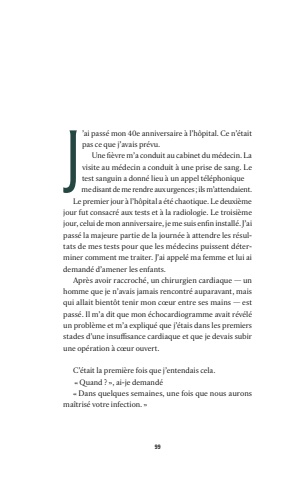 99J%u2019ai pass%u00e9 mon 40e anniversaire %u00e0 l%u2019h%u00f4pital. Ce n%u2019%u00e9tait pas ce que j%u2019avais pr%u00e9vu. Une fi%u00e8vre m%u2019a conduit au cabinet du m%u00e9decin. La visite au m%u00e9decin a conduit %u00e0 une prise de sang. Le test sanguin a donn%u00e9 lieu %u00e0 un appel t%u00e9l%u00e9phonique me disant de me rendre aux urgences ; ils m%u2019attendaient. Le premier jour %u00e0 l%u2019h%u00f4pital a %u00e9t%u00e9 chaotique. Le deuxi%u00e8me jour fut consacr%u00e9 aux tests et %u00e0 la radiologie. Le troisi%u00e8me jour, celui de mon anniversaire, je me suis enfin install%u00e9. J%u2019ai pass%u00e9 la majeure partie de la journ%u00e9e %u00e0 attendre les r%u00e9sultats de mes tests pour que les m%u00e9decins puissent d%u00e9terminer comment me traiter. J%u2019ai appel%u00e9 ma femme et lui ai demand%u00e9 d%u2019amener les enfants. Apr%u00e8s avoir raccroch%u00e9, un chirurgien cardiaque %u2014 un homme que je n%u2019avais jamais rencontr%u00e9 auparavant, mais qui allait bient%u00f4t tenir mon c%u0153ur entre ses mains %u2014 est pass%u00e9. Il m%u2019a dit que mon %u00e9chocardiogramme avait r%u00e9v%u00e9l%u00e9 un probl%u00e8me et m%u2019a expliqu%u00e9 que j%u2019%u00e9tais dans les premiers stades d%u2019une insuffisance cardiaque et que je devais subir une op%u00e9ration %u00e0 c%u0153ur ouvert. C%u2019%u00e9tait la premi%u00e8re fois que j%u2019entendais cela. %u00ab Quand ? %u00bb, ai-je demand%u00e9%u00ab Dans quelques semaines, une fois que nous aurons ma%u00eetris%u00e9 votre infection. %u00bb